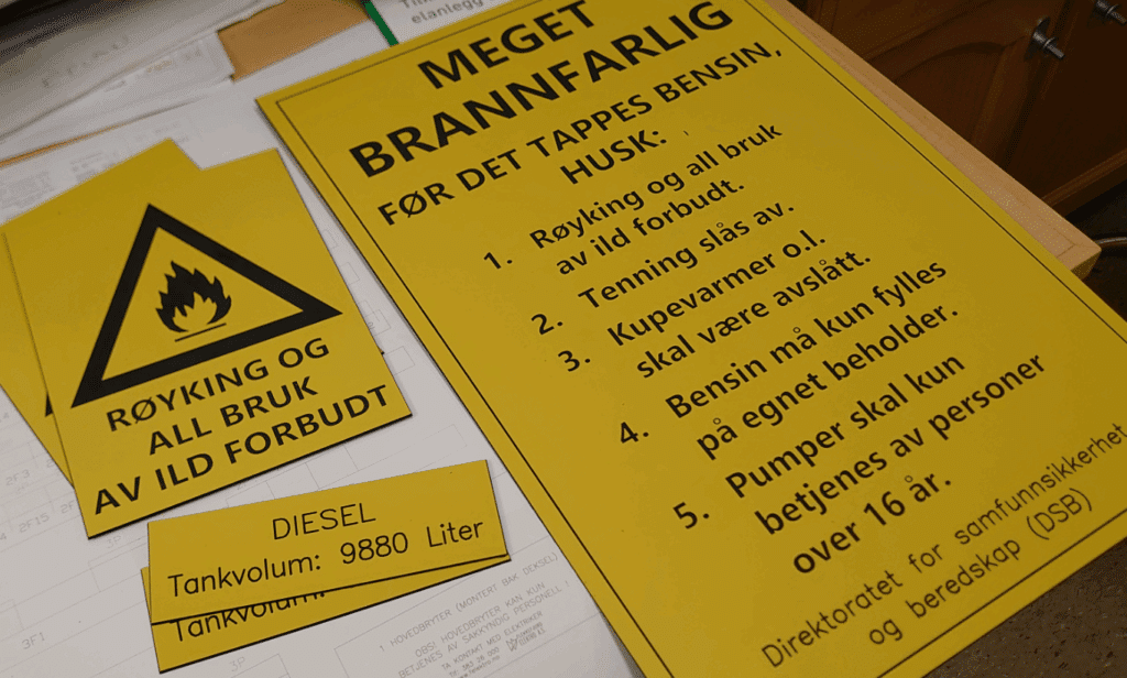 Skilt kan lages klare med hull for skrufester eller leveres ferdig med påsatt dobbeltsidig tape/borrelås.