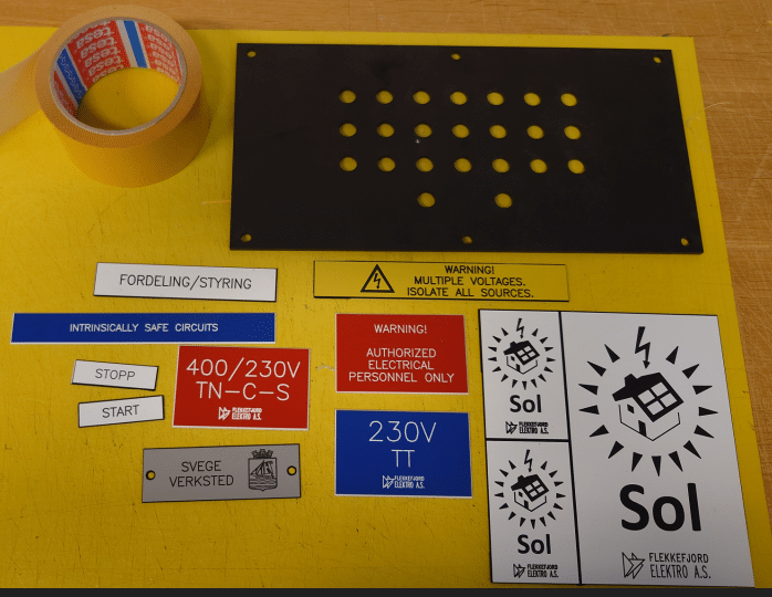 Vi har egen graveringsmaskin som kan lage det du ønsker i holdbar plast i flere fargevarianter.